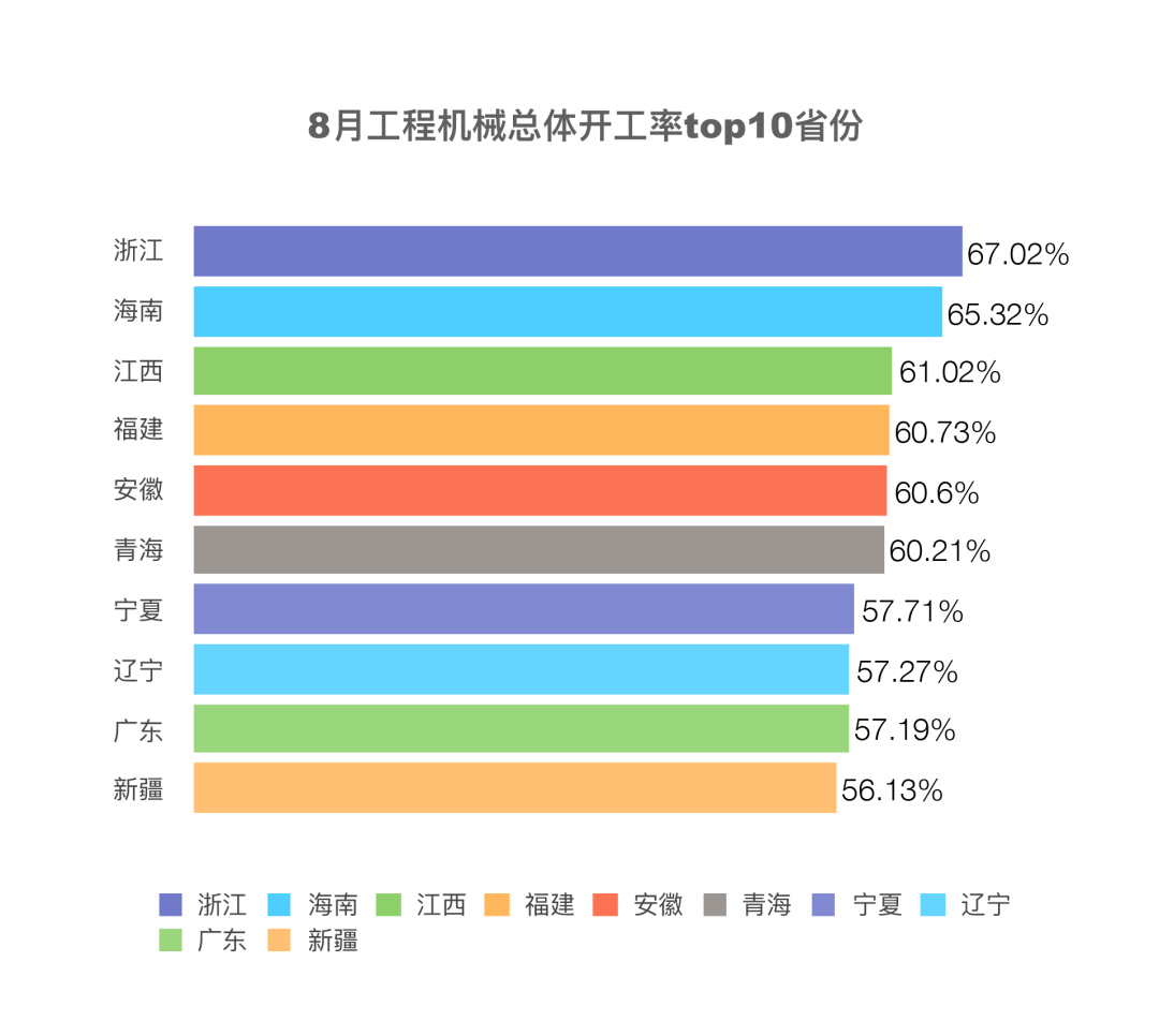 8月份,全国工程机械平均开工率为43.42%。综合开工率排名前十的省份分别是:浙江、海南、江西、福建、安徽、青海、宁夏、辽宁、广东和新疆。其中,全国共有17个省份开工率超过50%。